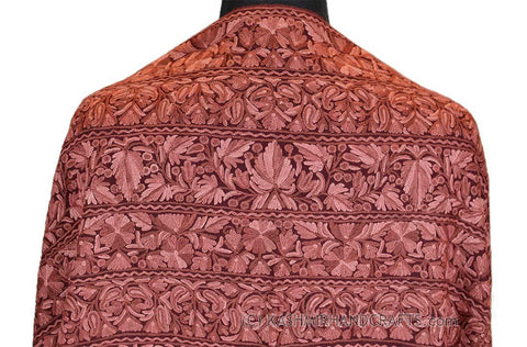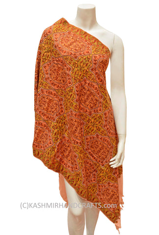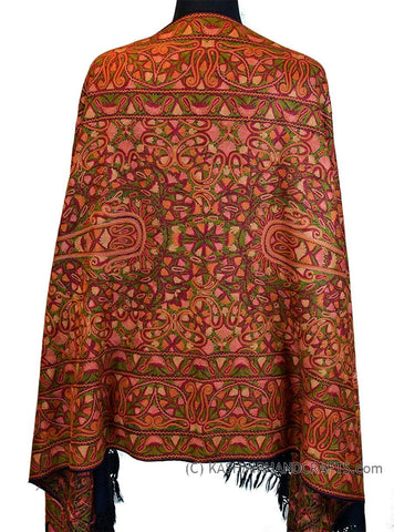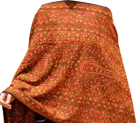 Kashmir Royal Peach Paisley Jamawar Shawl Hand Embroidered Suzani Needlework Wrap 27x76"
