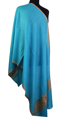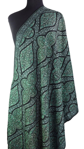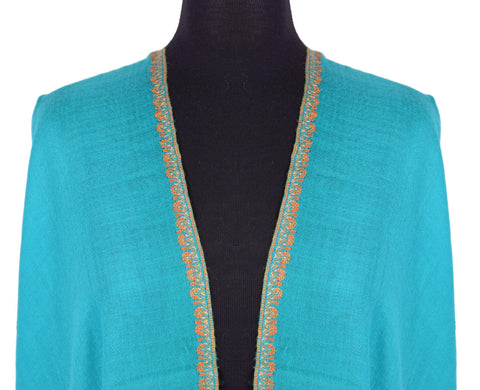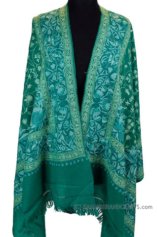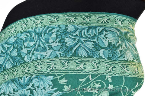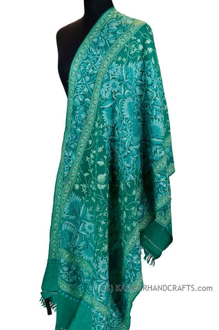 Teal Green Floral Kashmir Shawl Hand Embroidered Wrap II Suzani Needlework Wrap 27x76"