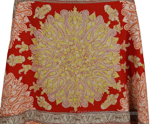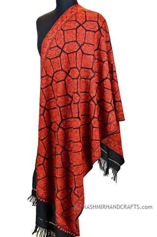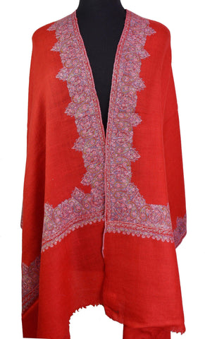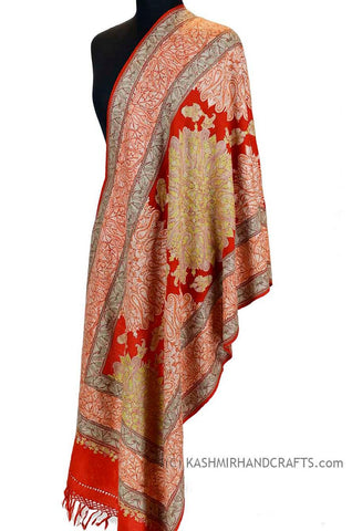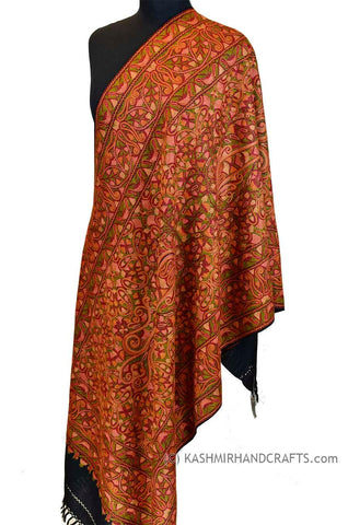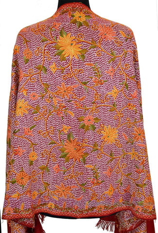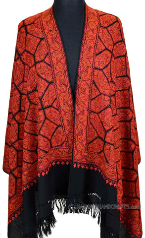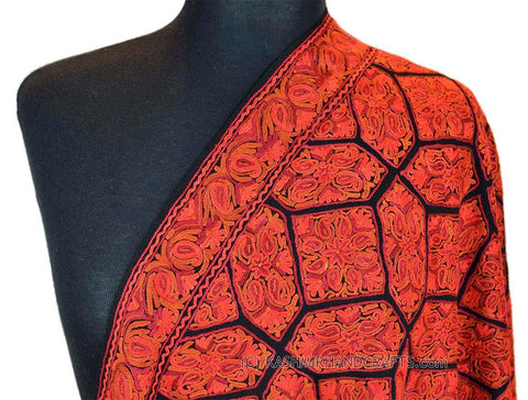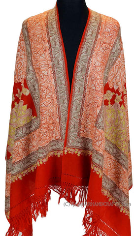 Orange Red Paisley Floral Jamawar Kashmir Shawl Hand Embroidered Suzani Needlework Wrap 27x76"