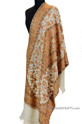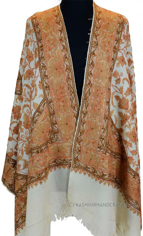 Natural Tan Floral Kashmir Shawl Hand Embroidered Suzani Needlework Wrap 27x76"