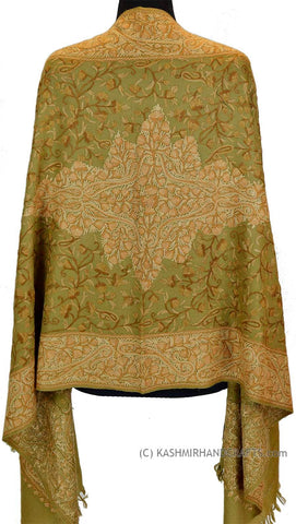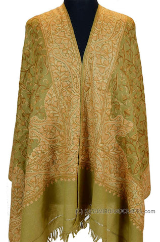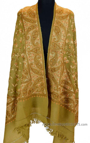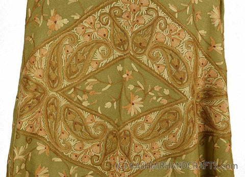 Kashmir Olive Green Shawl Floral Design Poshkaar Hand Embroidered Suzani Needlework Wrap 27x76"