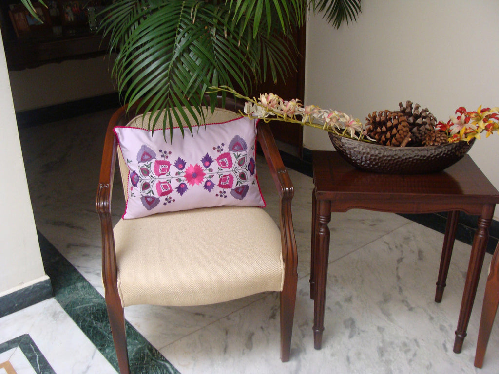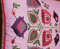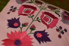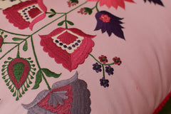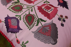 The Tree of Life branching up to the sky with and its roots in the earth, this all natural light lavender lilac decorative pillow cover offers a dramatic yet spiritual accent to any room. The entire twill cotton base of the pillow is overlaid with applique and embroidery work, creating an extraordinary show piece for your decor. This is world-class workmanship created to enhance your world with dynamic color and uniqye stylized motifs.