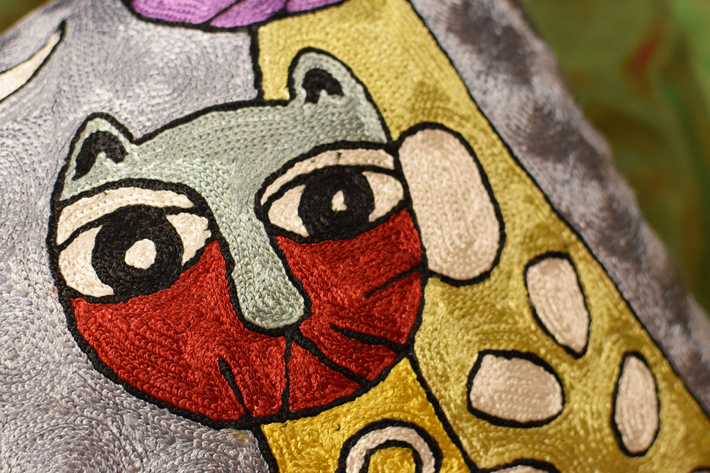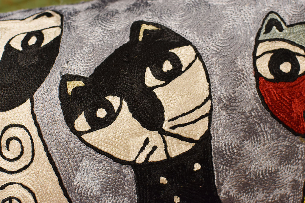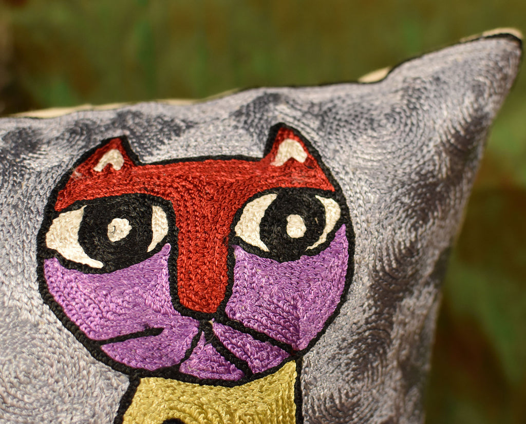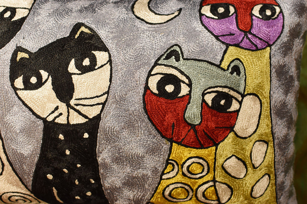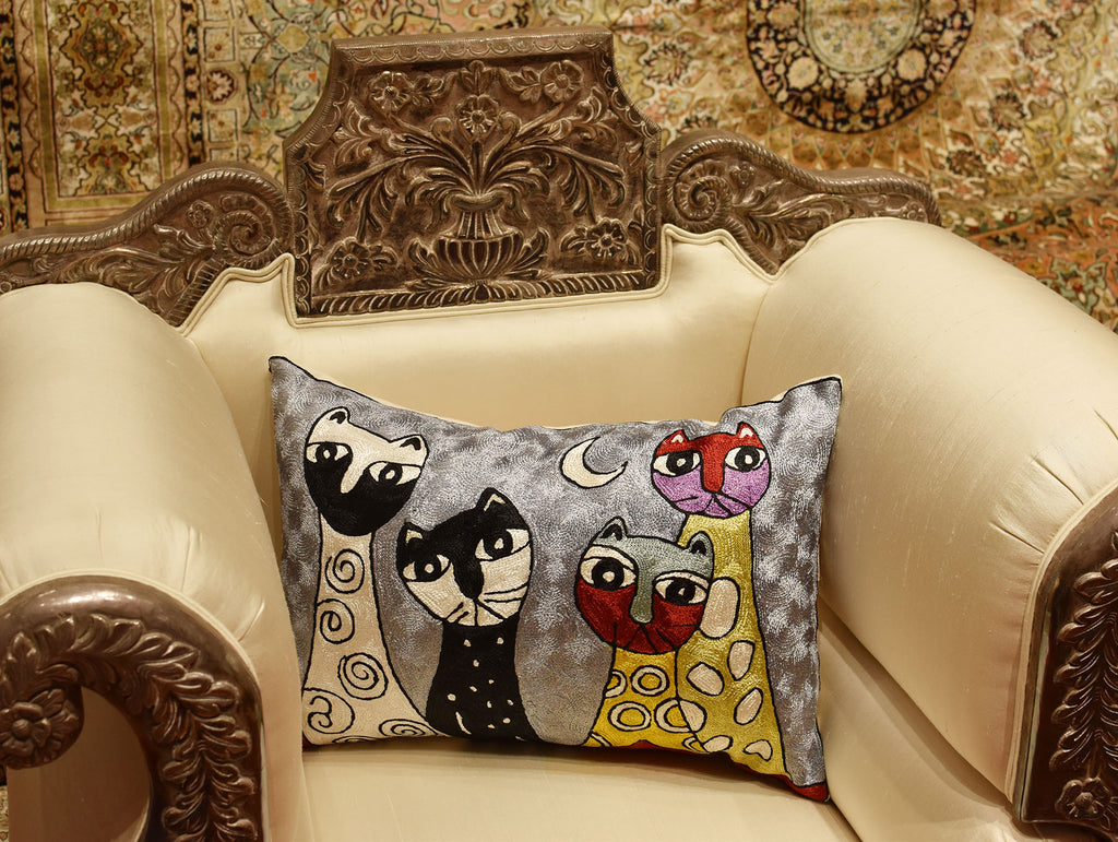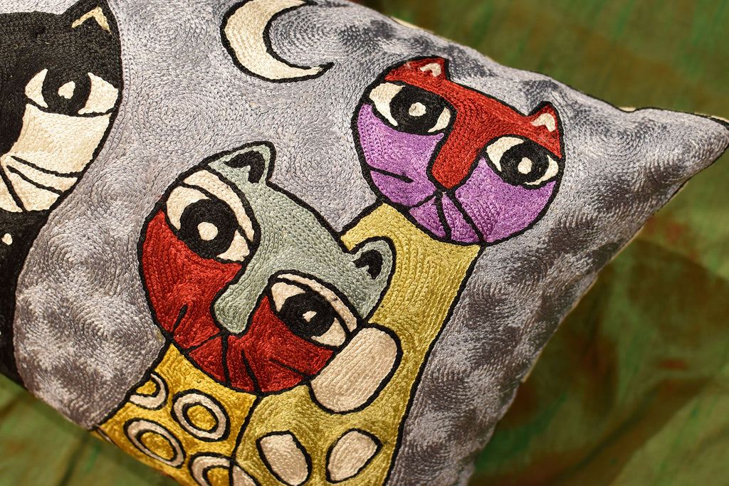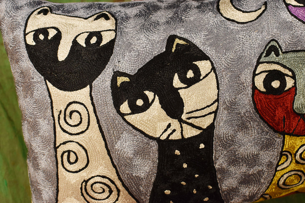 This Lumbar light blue Picasso inspired contemporary cat cushion cover is hand embroidered using chain stitch. Unique design and Picasso cubism make this pillow artful and must for any modern home. It would make an exciting accent pillow for your couch, sofa or home office. Expertly handcrafted chain-stitch embroidery with a design inspired by the works of the modern artist. Create a vibrant point of interest for your decor.