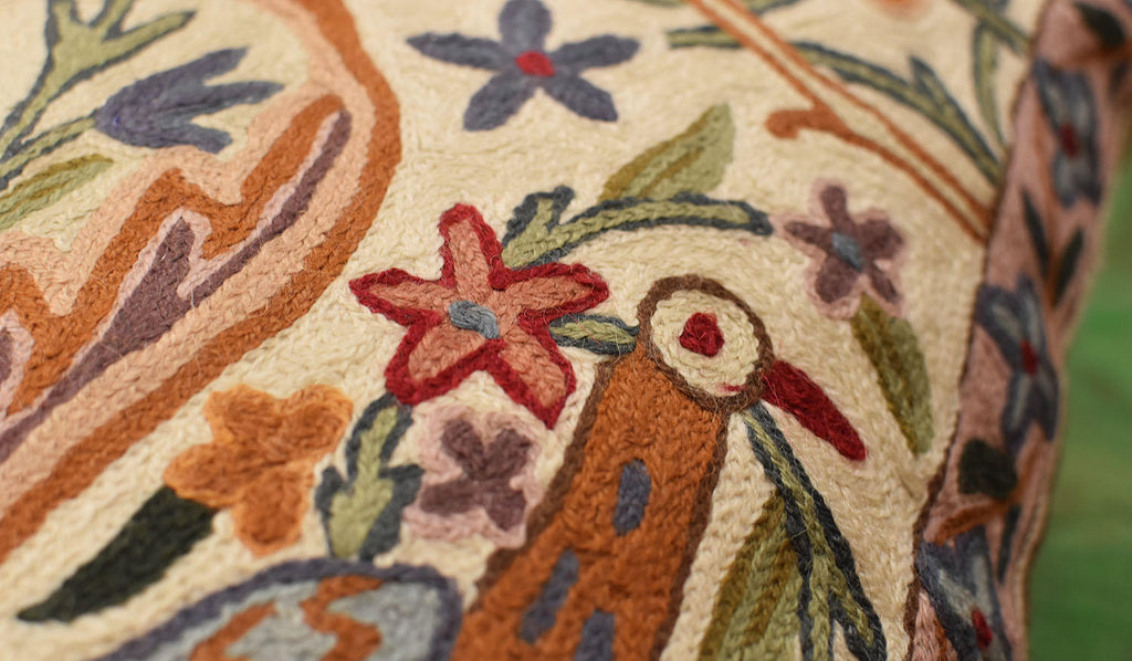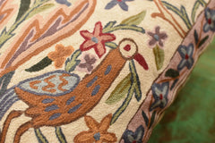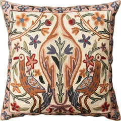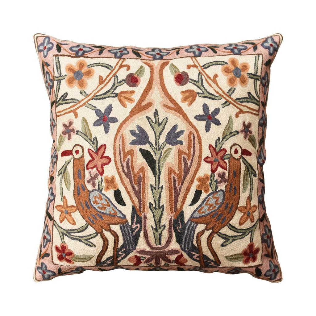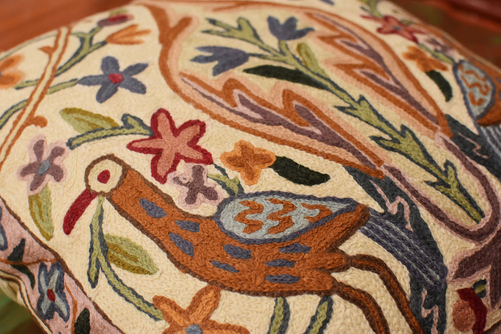This modern floral pillow cover has refreshing floral designs in ivory or cream background with flower design and two crane birds in various colors. The decorative pillow cover forms a perfect symmetry in color and design and would make an enticing modern accent pillow for your home. Whether this floral pillow is used in garden, patio, or in a room, on a sofa, chair or chaise, this all natural fiber, wool embroidered chain stitch on cotton base is soft, practical and durable.Wherever you place this accent pillow indoors or outdoors, it is sure to draw attention. The Kashmir wool thread makes it soft to the touch, and the texture of the embroidery is a sensory delight.