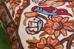 A close-up view of this handmade pillow cover allows you to see the amazing chain-stitch embroidery work of master artisans who have practiced this art their entire lives. This decorative pillow cover could grace the cabin of your boat or the chair in your solarium and yet be equally as comfortable in your den.