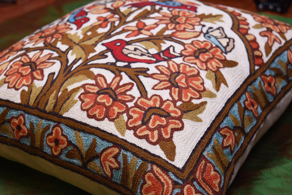 This beautiful tree of life birds and butterflies suzani pillow cover has refreshing design elements embroidered in unique floral style and design. The design elements are done in beautiful colors on an ivory background. The decorative pillow cover forms a perfect balance in color and design and would make an enticing modern accent pillow for your home. Whether this modern elements suzani pillow is used in a garden, patio, or in a room, on a sofa, chair, or chaise, this all-natural fiber would make an enticing pillow cover. Hand embroidered in soft wool in a chain stitch on a cotton base, this natural pillow cover is soft, practical, and durable.