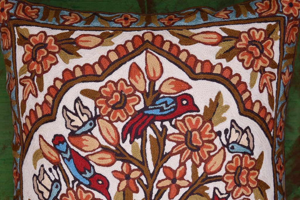 Bird & Butterflies Decorative Pillow Cover Gold Tree of Life Handembroidered Wool 18x18
