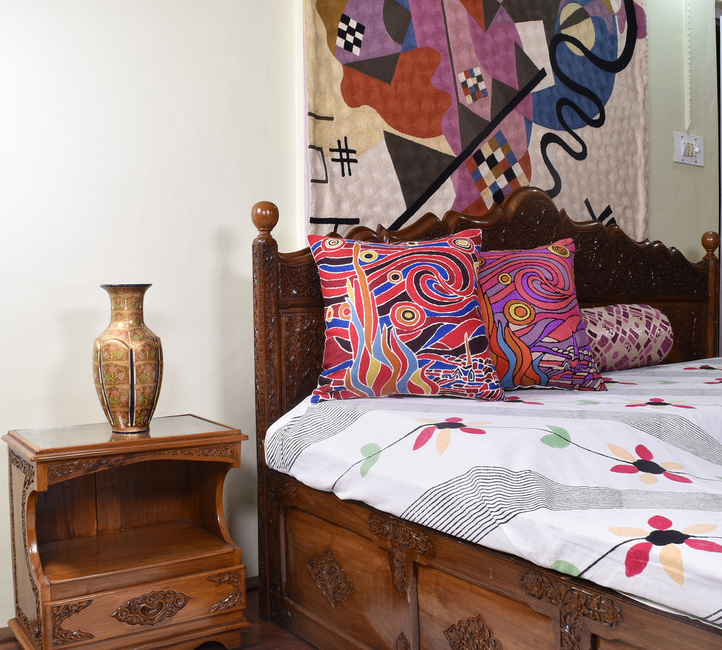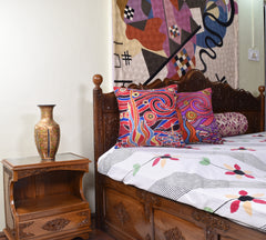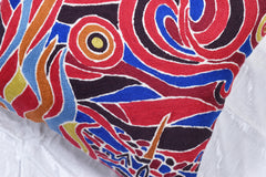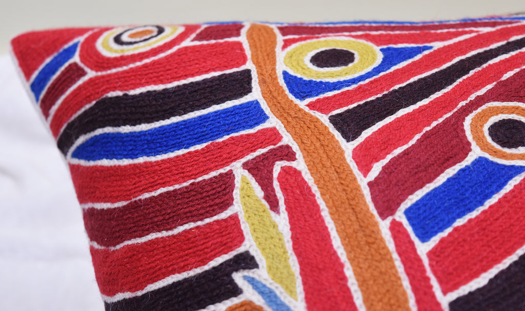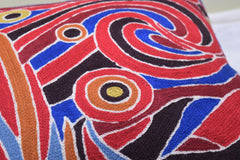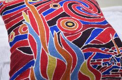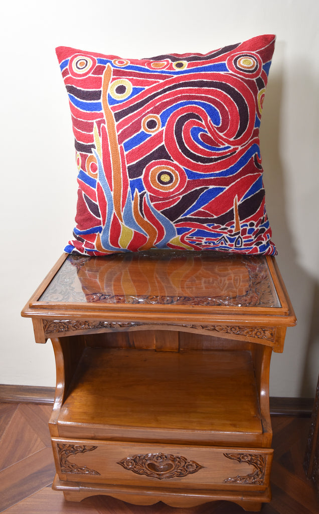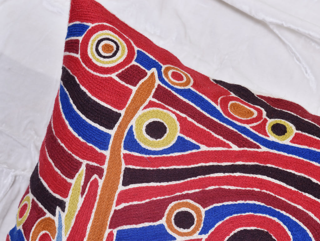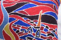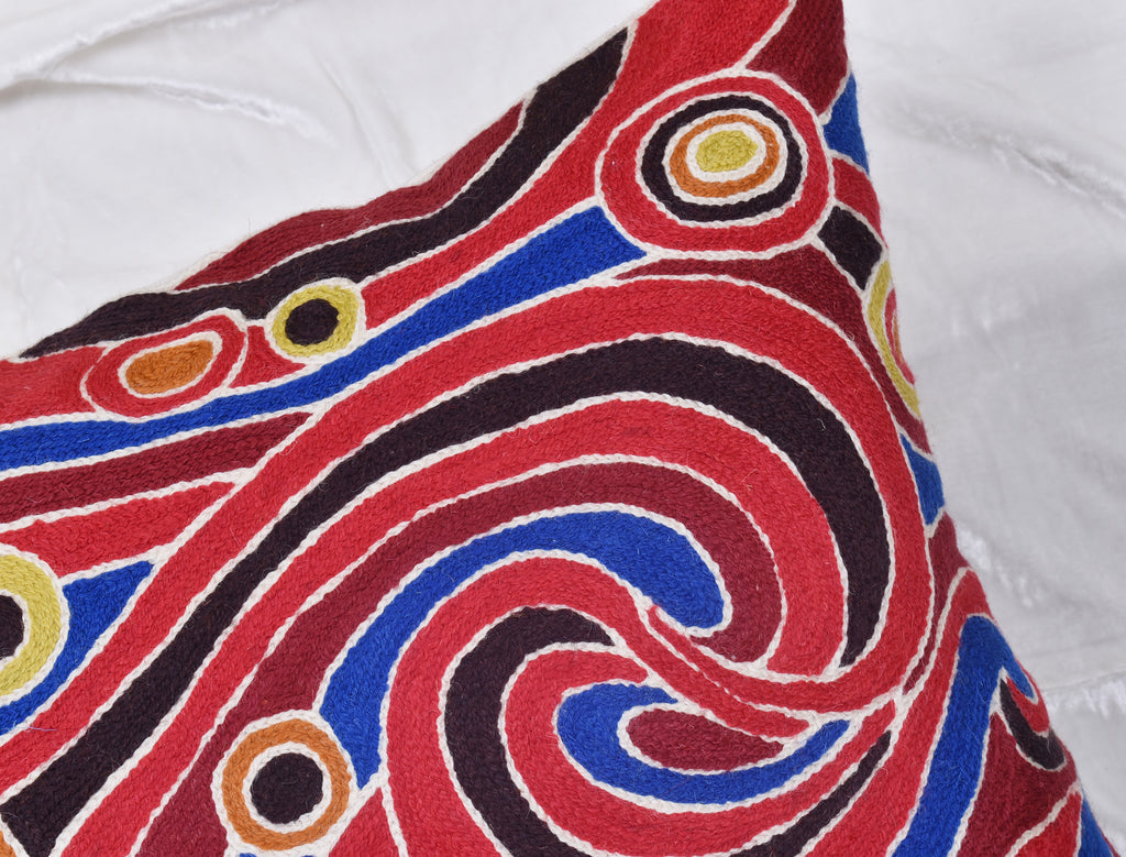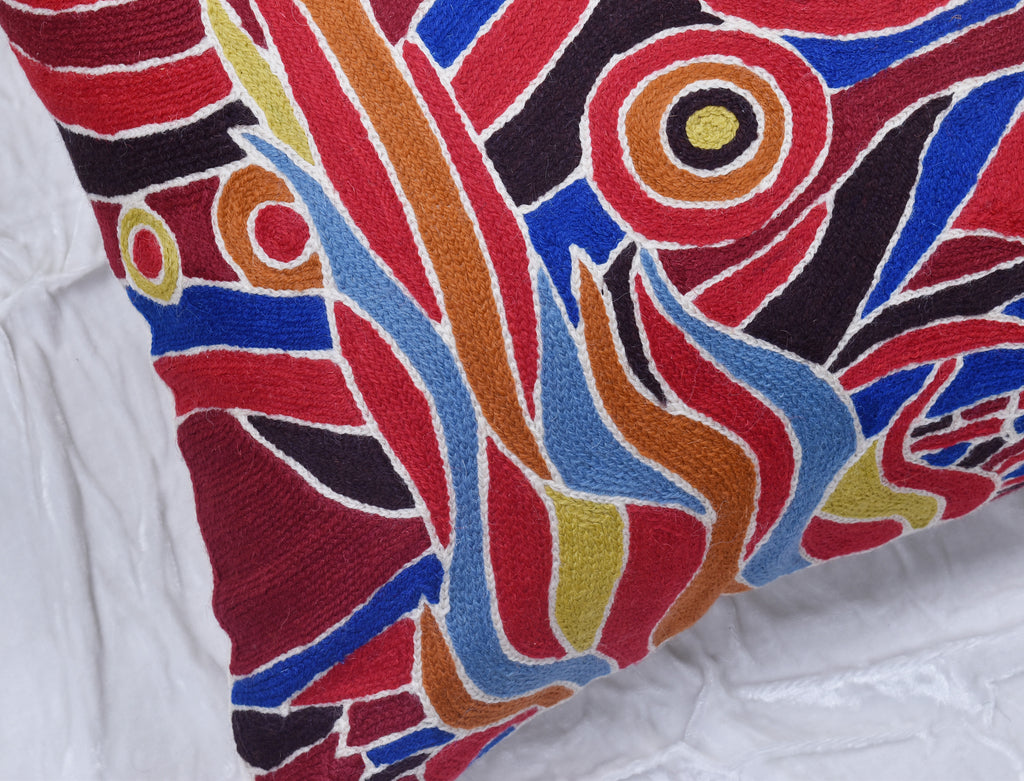 A close-up view of this abstract pillow cover allows you to see the amazing chain-stitch embroidery work of master artisans who have practiced this art their entire lives. This abstract decorative pillow cover could grace the cabin of your boat or the chair in your solarium and yet be equally as comfortable in your den.
