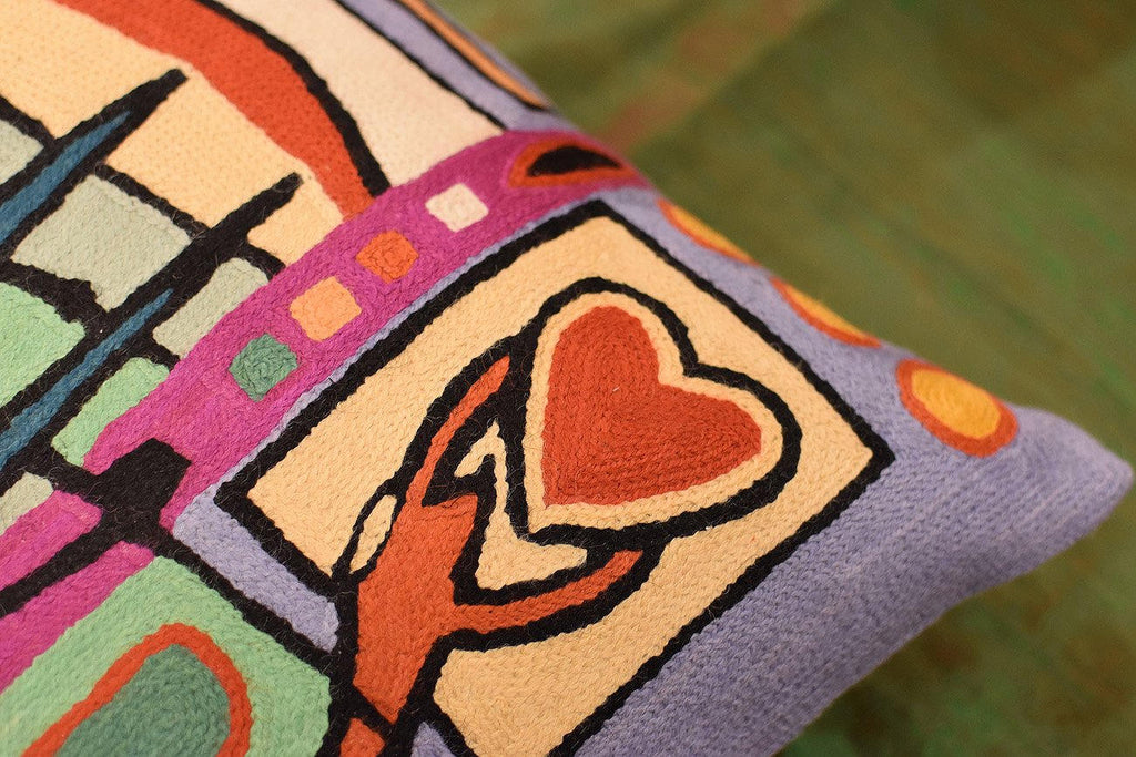 A close-up view of this abstract pillow cover allows you to see the amazing chain-stitch embroidery work of master artisans who have practiced this art their entire lives.Chain stitch embroidery on a cotton base produces a soft, fine crewel, and the stitches create definite swirls as distinct as your fingerprint. Kashmiri craftsmen produce the finest quality chain stitch needlework in the world.
