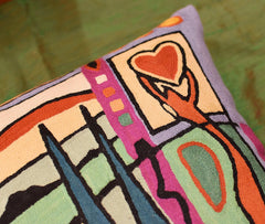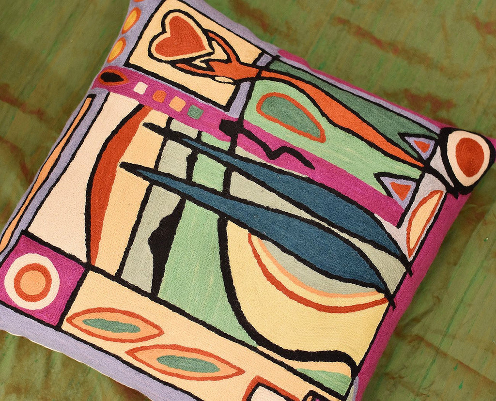 Kashmir is proud to bring together the modern abstract artwork pillow collection, inspired by world renowned artist Alfred Gockel and hand embroidered by the finest artisans of Kashmir, into the living spaces of patrons and connoisseur's all around the world. These unique and modern pillows would bring the brighter elements of any room, creating a harmonious design and perfect air of sophistication. This decorative Cushion Cover Fun in the Sun VII throw pillow cover has beautiful colors and design hand embroidered in lively and refreshing colors. Swirls of colorful chain stitch embroidery hand embroidered from soft Kashmir wool adds a dazzling sheen to the creation. The eye-popping color and pattern of this creation is just what the designer ordered to create a fiery focal point in your decor. This all-natural accent pillow cover makes an enduring impression.