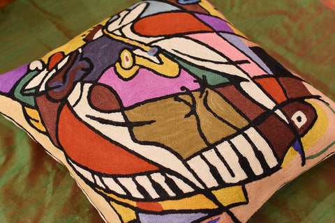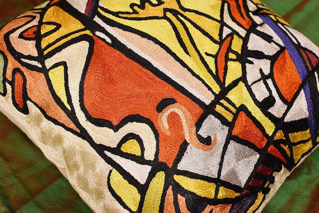 A close-up view of this abstract pillow cover allows you to see the amazing chain-stitch embroidery work of master artisans who have practiced this art their entire lives.Chain stitch embroidery on a cotton base produces a soft, fine crewel, and the stitches create definite swirls as distinct as your fingerprint. Kashmiri craftsmen produce the finest quality chain stitch needlework in the world. This abstract decorative pillow cover could grace the cabin of your boat or the chair in your solarium and yet be equally as comfortable in your den. Durable and easy to clean, this toss pillow will catch the eye of every passerby.