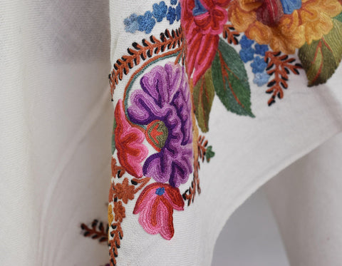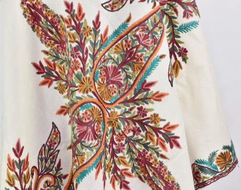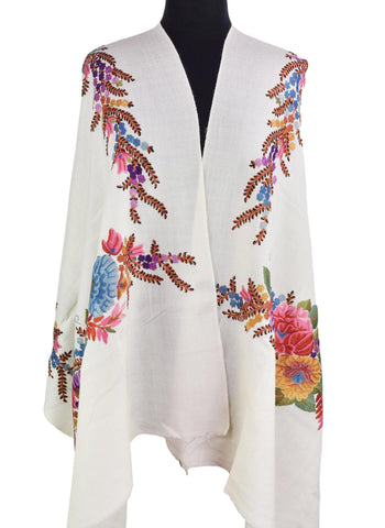 ivory cream floral kashmir shawl hand embroidered Suzani Needlework Wrap 27x76"