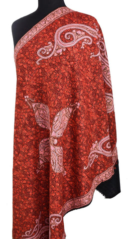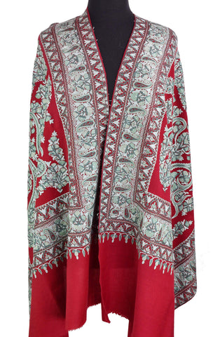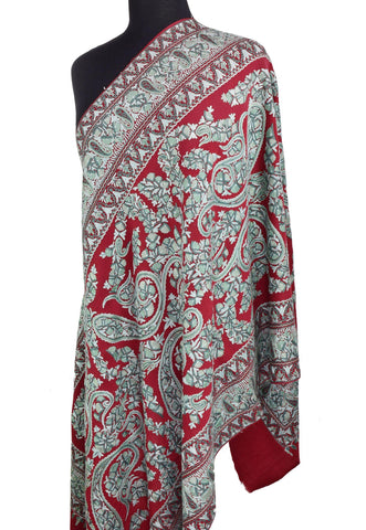 Royal Grand Mughal Red Jamawar Kashmir Shawl Hand Embroidered Suzani Needlework Wrap 27x76"