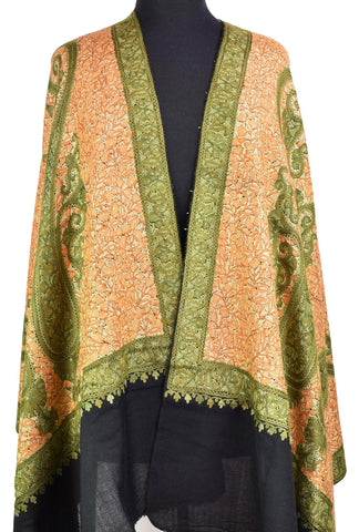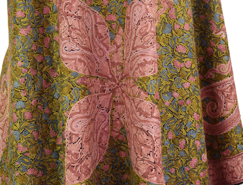 Kashmir Olive Green Shawl Floral Design Poshkaar Hand Embroidered Suzani Needlework Wrap 27x76"