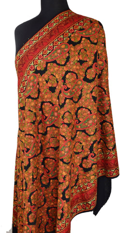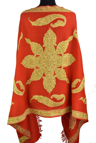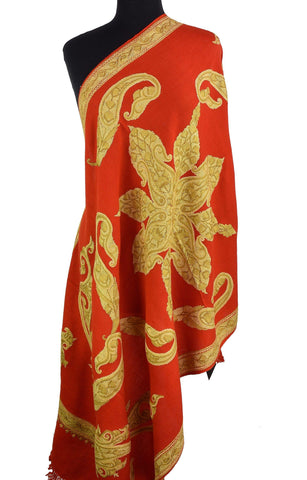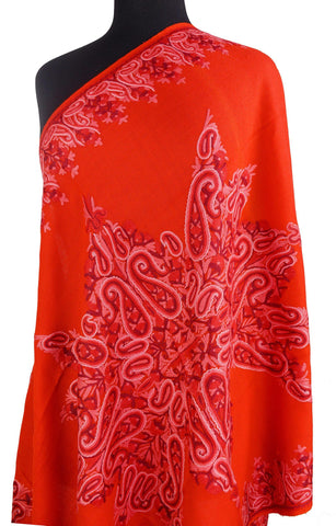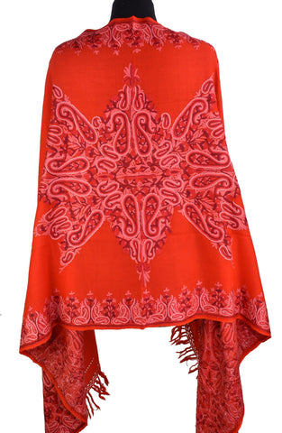 Orange Red Paisley Floral Jamawar Kashmir Shawl Hand Embroidered Suzani Needlework Wrap 27x76"