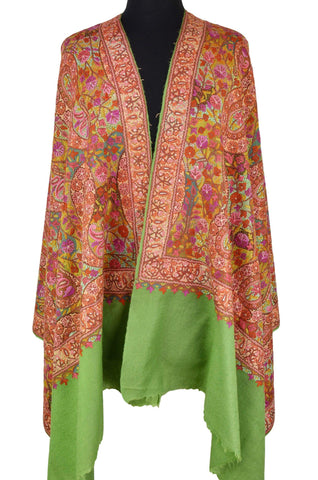 Lime Green Floral Kashmir Shawl Hand Embroidered Suzani Needlework Wrap 27x76"