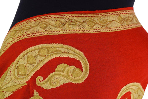 Scarlet Kashmir Shawl Paisley Red Gold Hand Embroidered Suzani Needlework Wrap 27x76"