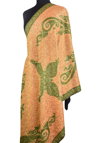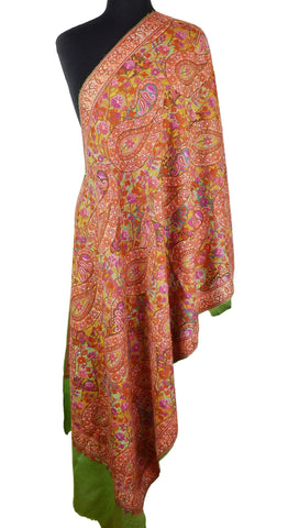 Kashmir Royal Peach Paisley Jamawar Shawl Hand Embroidered Suzani Needlework Wrap 27x76"