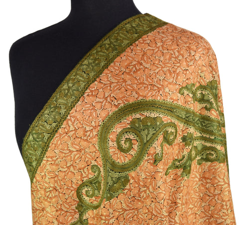 Melete Kashmir Shawl Paisley Gold Green Hand Embroidered Suzani Needlework Wrap 27x76"