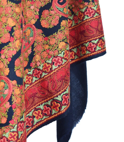 Kashmir Navy Red Shawl Floral Paisley Hand Embroidered Suzani Needlework Wrap 27x76"
