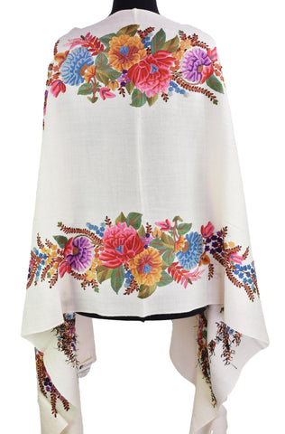 Aidos II Kashmir Shawl Floral Ivory Cream Hand Embroidered Suzani Needlework Wrap 27x76"