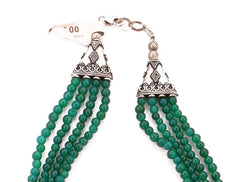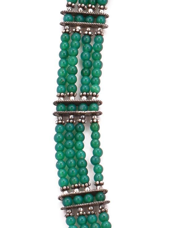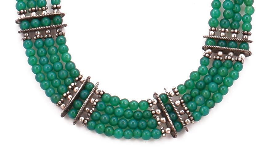 This Green Quartz Choker necklace has four glorious strands of hand-cut, hand-shaped, hand-strung AAA faceted rose quartz beads, interspersed with .925 silver beads and bars in an exquisite design. People who live from the heart usually are highly attracted to green. An alluring, true forest green onyx necklace with dozens of AAA natural gemstones set in a unique choker necklace style making a wonderful pattern. The sterling silver has been hand carved and coated with rhodium to give a fine finished look.