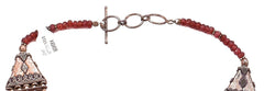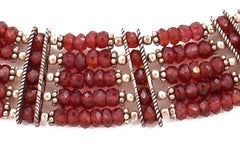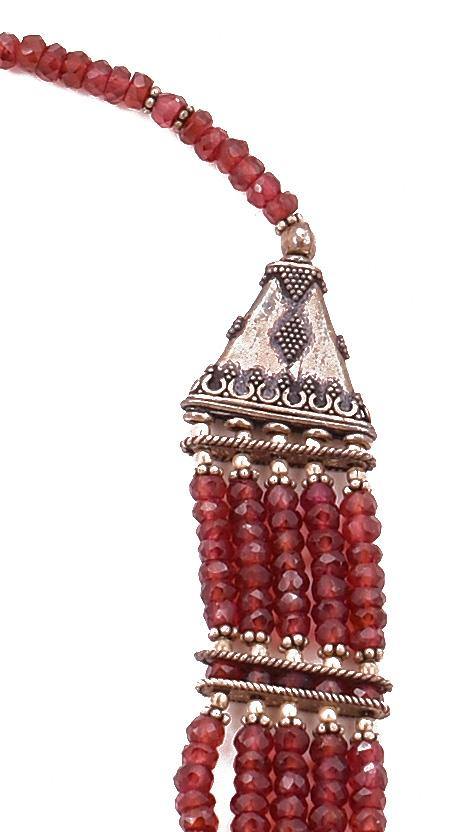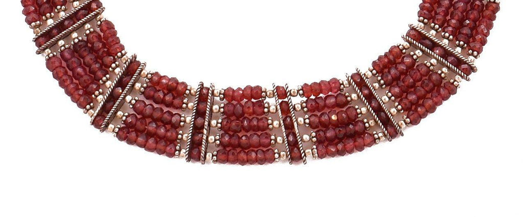 This red garnet small choker necklace has five glorious strands of hand-cut, hand-shaped, hand-strung AAA faceted garnet beads, interspersed with .925 silver beads and bars in an exquisite design. The beads are varied in their hue and show differentiation in texture due to their hand working, giving the necklace a very natural appearance. Looking like pomegranate seeds, rumored to be the fruit of the Garden of Eden, and prized as a symbol of fertility in many cultures, this magnificent choker is creativity in its very essence. The Egyptians considered the pomegranate a sign of prosperity, giving the wearer an aura of great wealth.