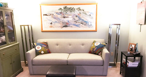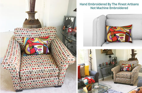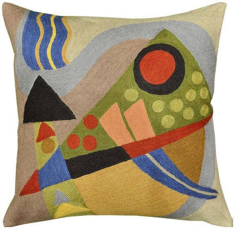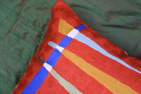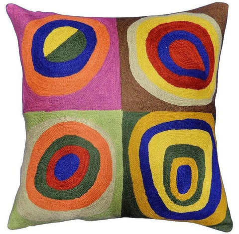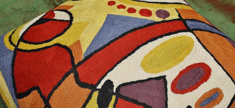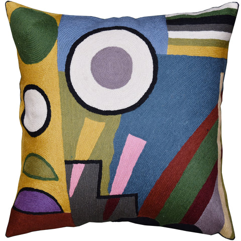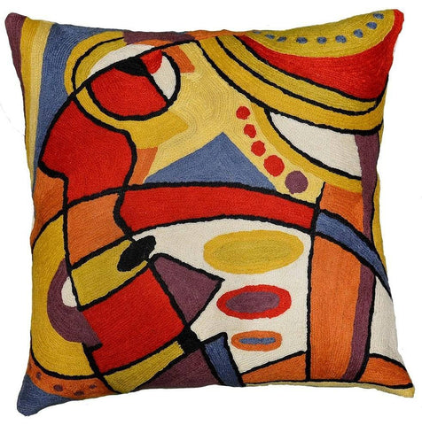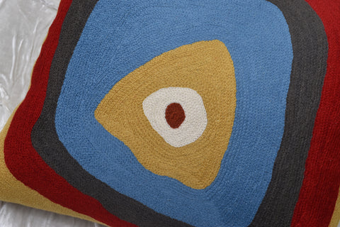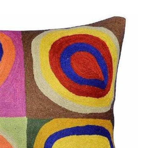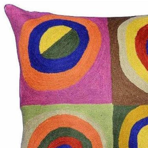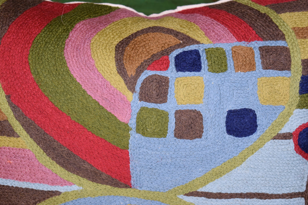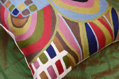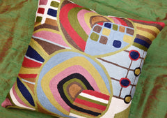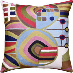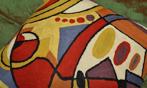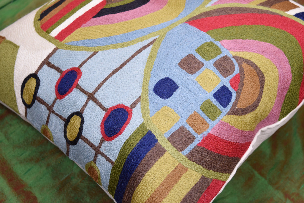 Hundertwasser Modern pillow Cover- F. Hundertwasser was an artist and architect known for his colorful, biomorphic designs. This cushion cover design has been created in Hundertwasser style by a Kashmiri handcraft artisan using chain stitch embroidery. The pleasing lines and hues of this modern art motif will stand out in your decor, showing you to be a person of taste. The counterbalance of warm earth tones and cool blues make this a stunning addition to your couch, chair, or chaise. Wool stitching on cotton construction makes it as practical and durable. Kashmiri artisans produce world-class, heirloom-quality handcrafted items.