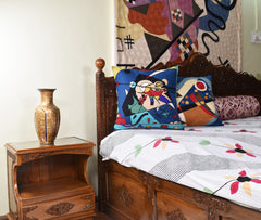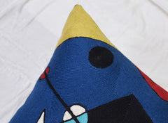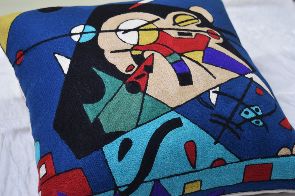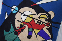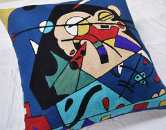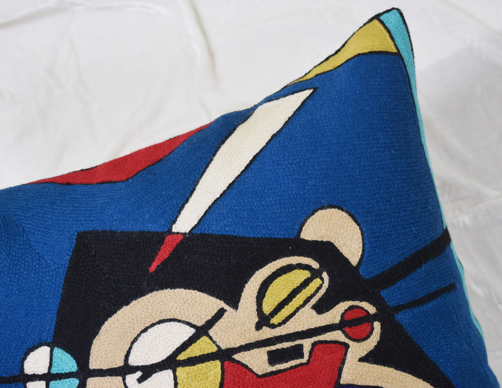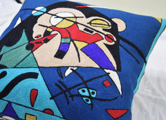 This blue Kandinsky decorative pillow cover is inspired by the famous abstract quiet harmony of Wassily Kandinsky. Star fragments and enigmatic hieroglyphs are artfully stitched in the finest Kashmir wool chain stitch needlework. This pillow cover has a lively color combination, the juxtaposition of red over red-purple colors highlighted with beautiful flows in various color combinations.