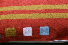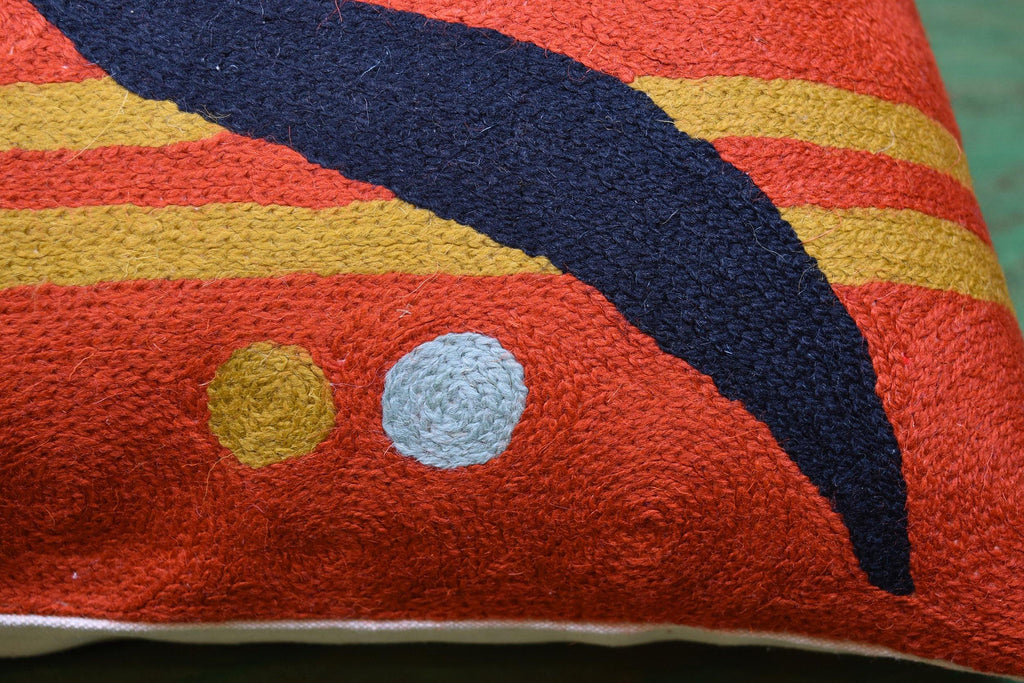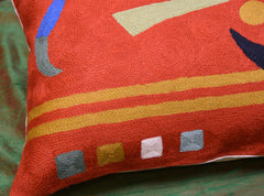 This modern decorative pillow cover is inspired by the artworks of Kandinsky. You can view the typical geometric forms in this colorful throw pillow cover which are more natural and free-flowing and are filled in with the deep orange background. Chain stitch embroidery on a cotton base produces a soft, fine crewel, and the stitches create definite swirls as distinct as your fingerprint. Kashmiri craftsmen produce the finest quality chain stitch needlework in the world.