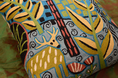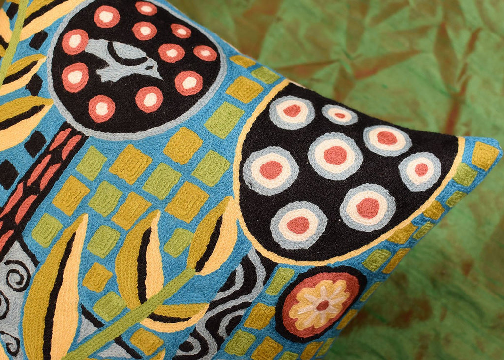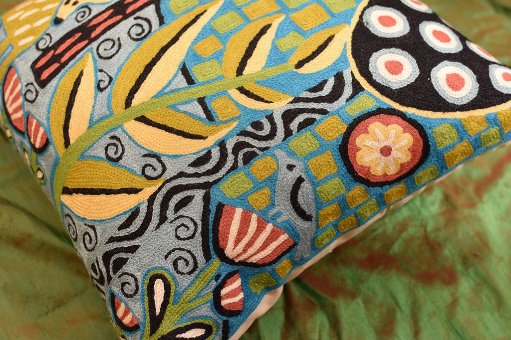 A close-up view of this abstract pillow cover allows you to see the amazing chain-stitch embroidery work of master artisans who have practiced this art their entire lives.This abstract decorative pillow cover could grace the cabin of your boat or the chair in your solarium and yet be equally as comfortable in your den.