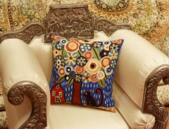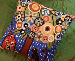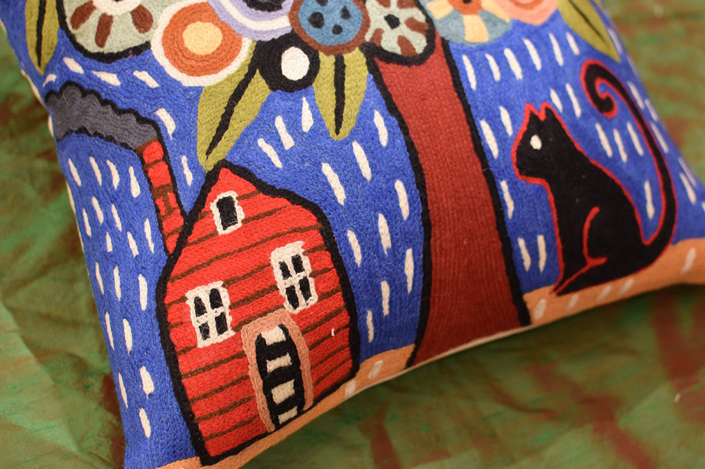 This folk art design decorative pillow cover shows a sitting cat with a red house and a tree