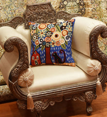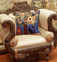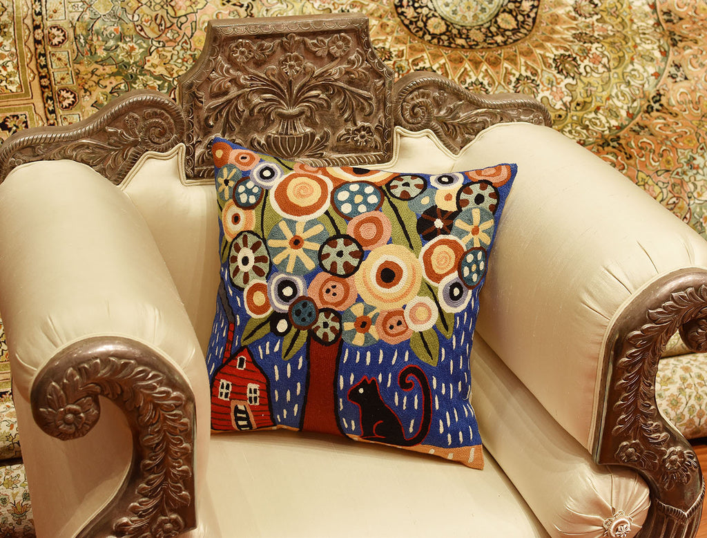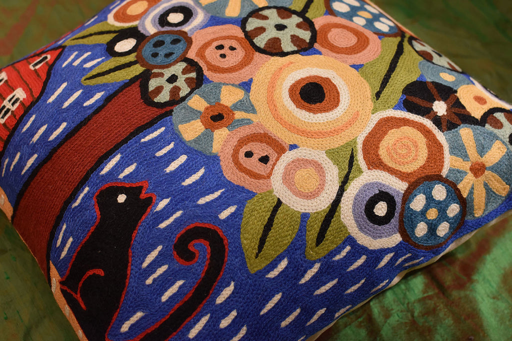 This contemporary throw pillow cover is hand embroidered by the finest artisans. Unique design and soulful colors make this accent pillow cover artful and must for any modern home. Wherever you place this accent pillow indoors or outdoors, it is sure to draw attention and create a vibrant point of interest for your decor.This toss pillow cover could grace the cabin of your boat or the chair in your solarium and yet be equally as comfortable in your office or den. Durable and easy to clean, this accent pillow will catch the eye of every passerby.The Kashmir wool thread makes it soft to the touch, and the texture of the all natural wool hand embroidery is a sensory delight and makes an enduring impression.
