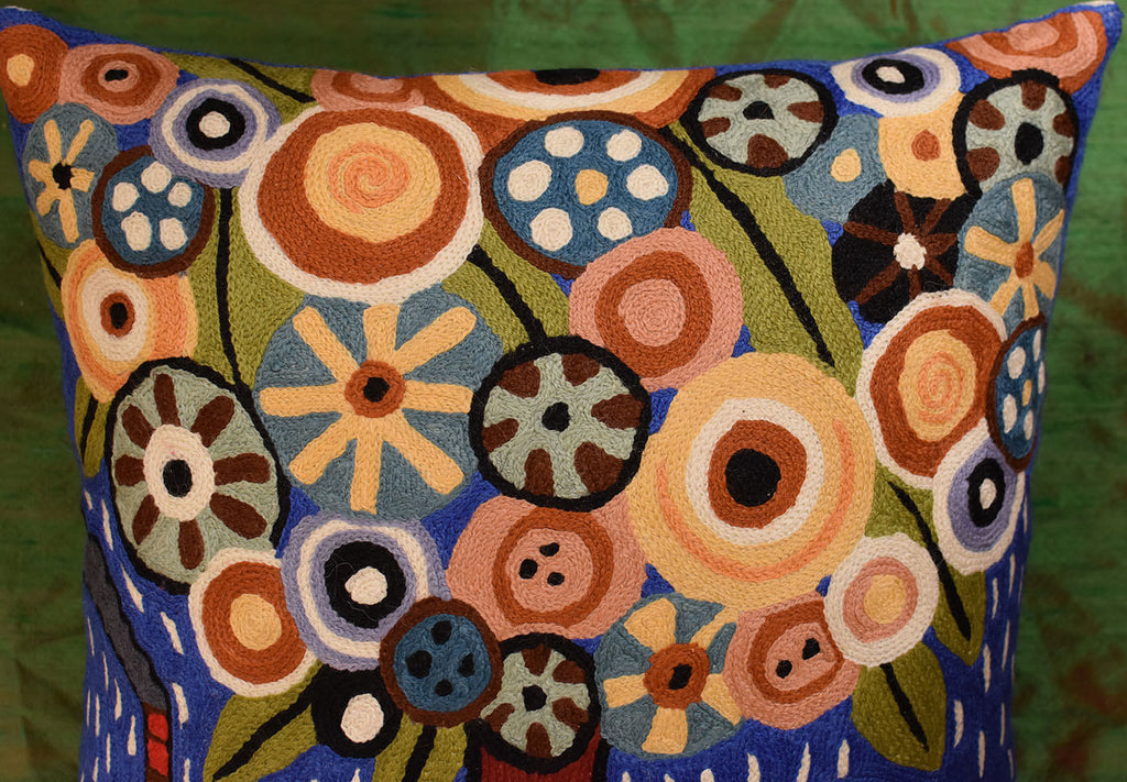 A close-up view of this abstract pillow cover allows you to see the amazing chain-stitch embroidery work of master artisans who have practiced this art their entire lives.This abstract decorative pillow cover could grace the cabin of your boat or the chair in your solarium and yet be equally as comfortable in your den.