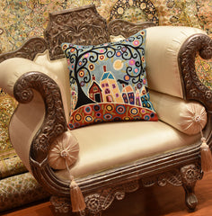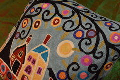 This contemporary throw pillow cover is hand embroidered by the finest artisans. Unique design and soulful colors make this accent pillow cover artful and must for any modern home. Wherever you place this accent pillow indoors or outdoors, it is sure to draw attention and create a vibrant point of interest for your decor.This toss pillow cover could grace the cabin of your boat or the chair in your solarium and yet be equally as comfortable in your office or den. Durable and easy to clean, this accent pillow will catch the eye of every passerby.The Kashmir wool thread makes it soft to the touch, and the texture of the all natural wool hand embroidery is a sensory delight and makes an enduring impression.