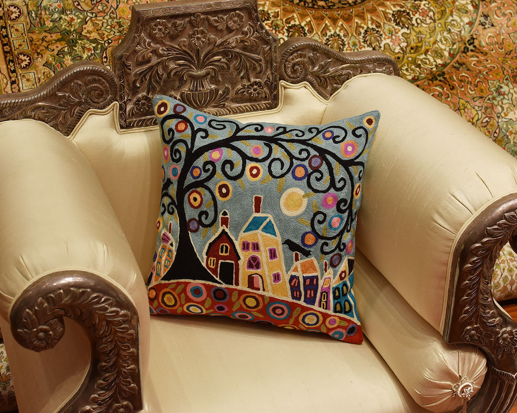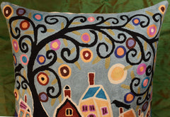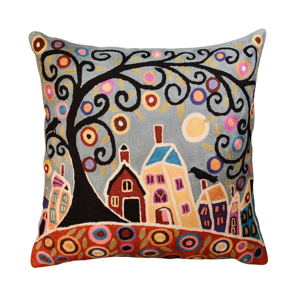 House Barn Birds & A Tree Karla Gerard Pillow Cover Handembroidered Wool 18"x18"