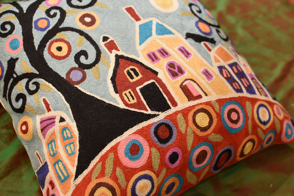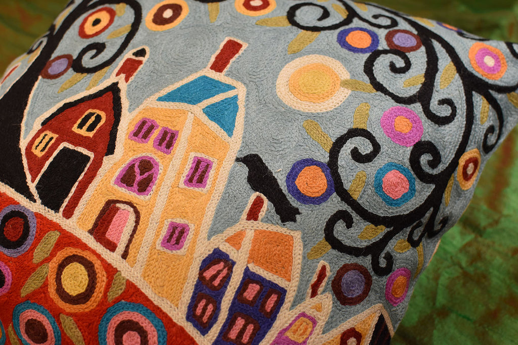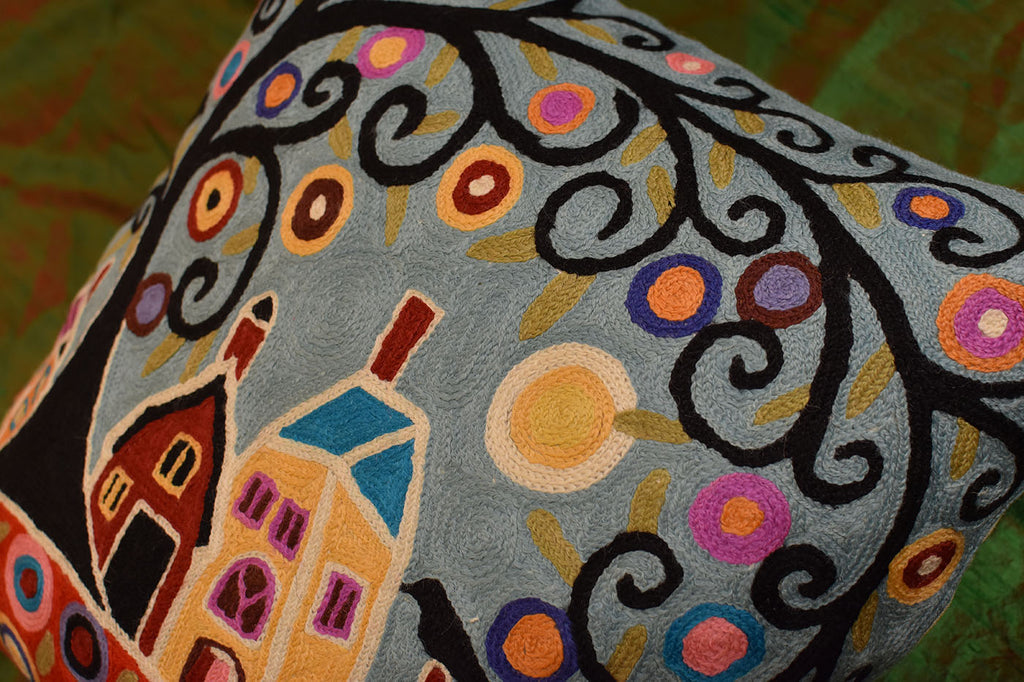 A close-up view of this abstract pillow cover allows you to see the amazing chain-stitch embroidery work of master artisans who have practiced this art their entire lives.This abstract decorative pillow cover could grace the cabin of your boat or the chair in your solarium and yet be equally as comfortable in your den.