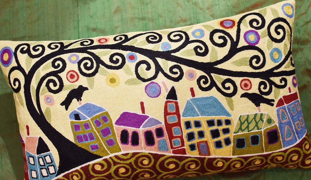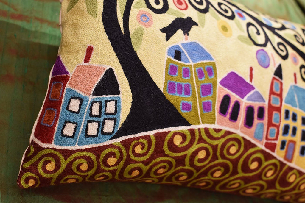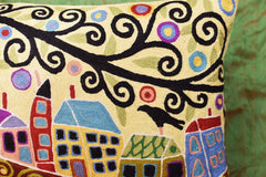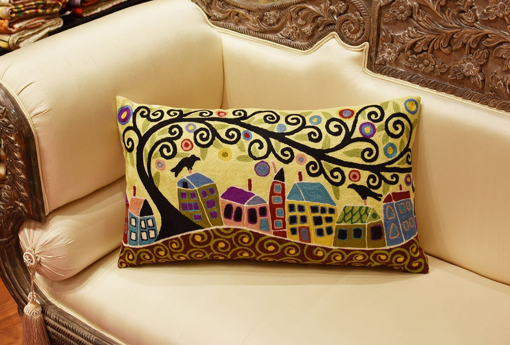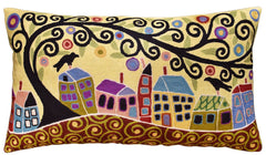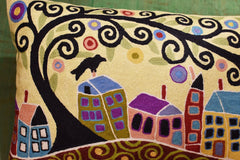 Houses Birds & Tree Karla Gerard Throw Pillow Cover Handembroidered Wool 14"x24"