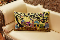 This design decorative pillow cover is of a whimsical village of leaning houses under a large blooming swirl tree with birds. A very typical Karla Gerard design decorative pillow cover. This beautiful design decorative pillow cover would add some whimsy and call attention to itself in any setting.