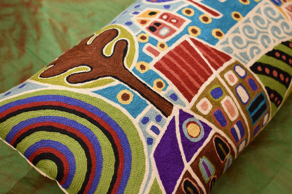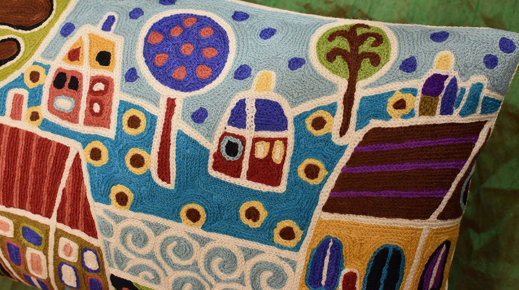 A close-up view of this abstract pillow cover allows you to see the amazing chain-stitch embroidery work of master artisans who have practiced this art their entire lives.This abstract decorative pillow cover could grace the cabin of your boat or the chair in your solarium and yet be equally as comfortable in your den.