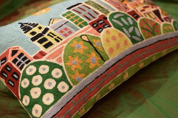 A close-up view of this abstract pillow cover allows you to see the amazing chain-stitch embroidery work of master artisans who have practiced this art their entire lives.This abstract decorative pillow cover could grace the cabin of your boat or the chair in your solarium and yet be equally as comfortable in your den.