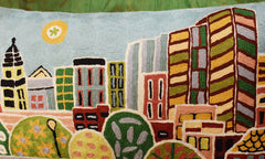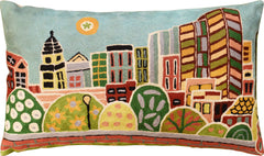 This colorful city scape design decorative pillow cover was inspired by the Rose Fitzgerald Kennedy Greenway in Boston, MA. It boasts fountains, lamp posts, lots of trees and the city's tall skyscrapers and buildings. See if you can spot some landmarks. A unique piece to add a splash of color to any room.
