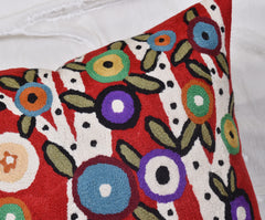 A close-up view of this abstract pillow cover allows you to see the amazing chain-stitch embroidery work of master artisans who have practiced this art their entire lives. This abstract decorative pillow cover could grace the cabin of your boat or the chair in your solarium and yet be equally as comfortable in your den.