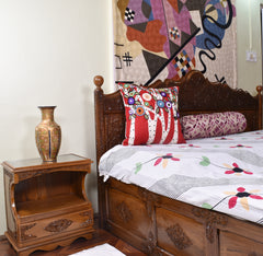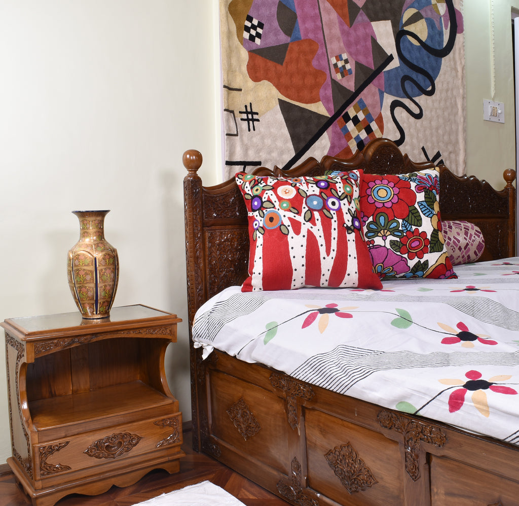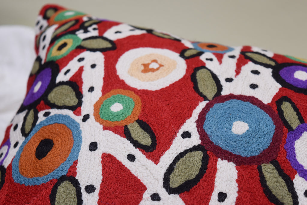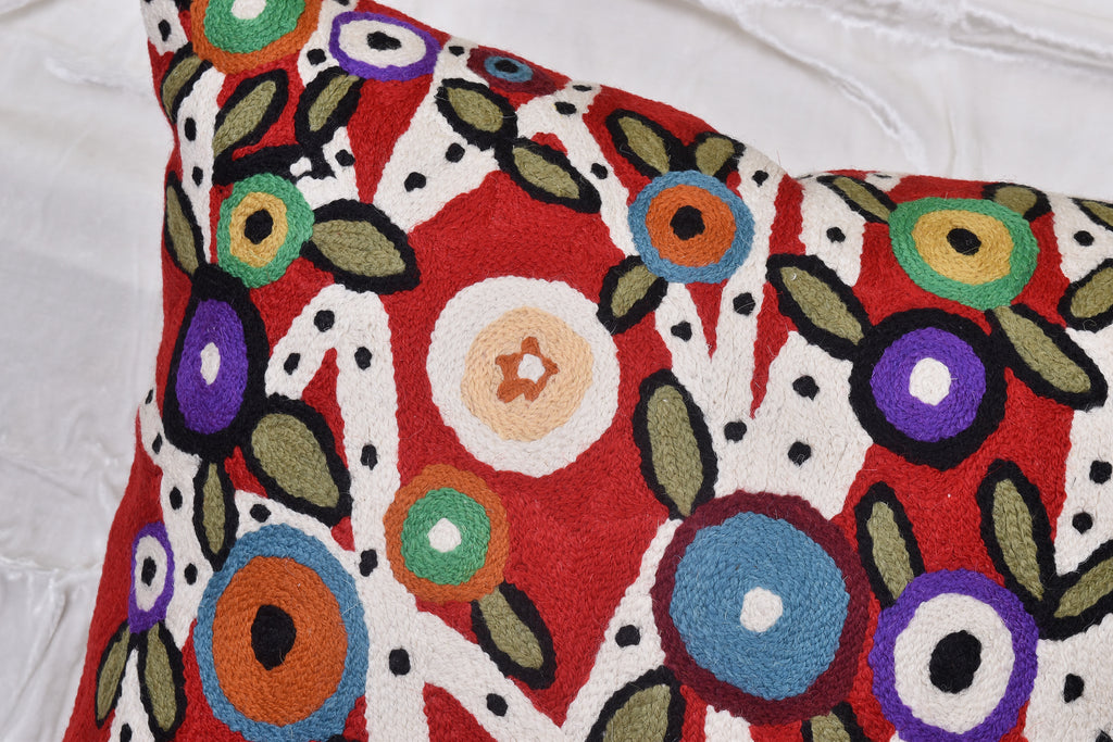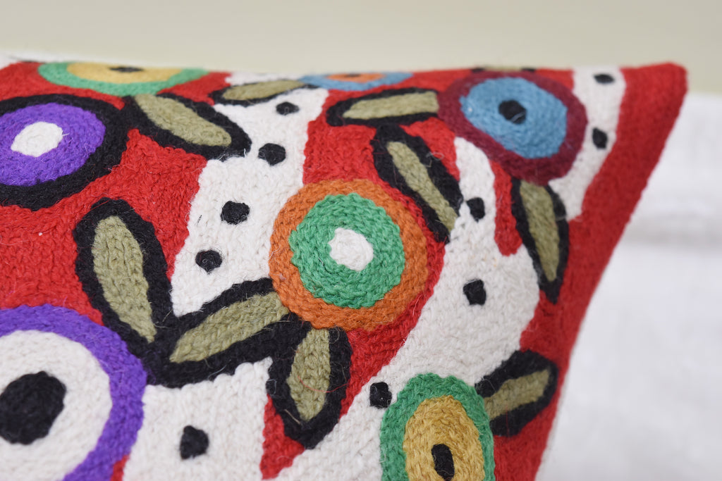 This contemporary throw pillow cover is hand embroidered by the finest artisans. Unique design and soulful colors make this accent pillow cover artful and a must for any modern home. Wherever you place this accent pillow indoors or outdoors, it is sure to draw attention and create a vibrant point of interest for your decor. This toss pillow cover could grace the cabin of your boat or the chair in your solarium and yet be equally as comfortable in your office or den. Durable and easy to clean, this accent pillow will catch the eye of every passerby. The Kashmir wool thread makes it soft to the touch, and the texture of the all-natural wool hand embroidery is a sensory delight and makes an enduring impression.