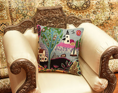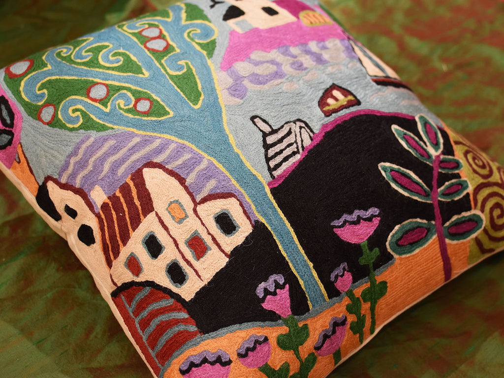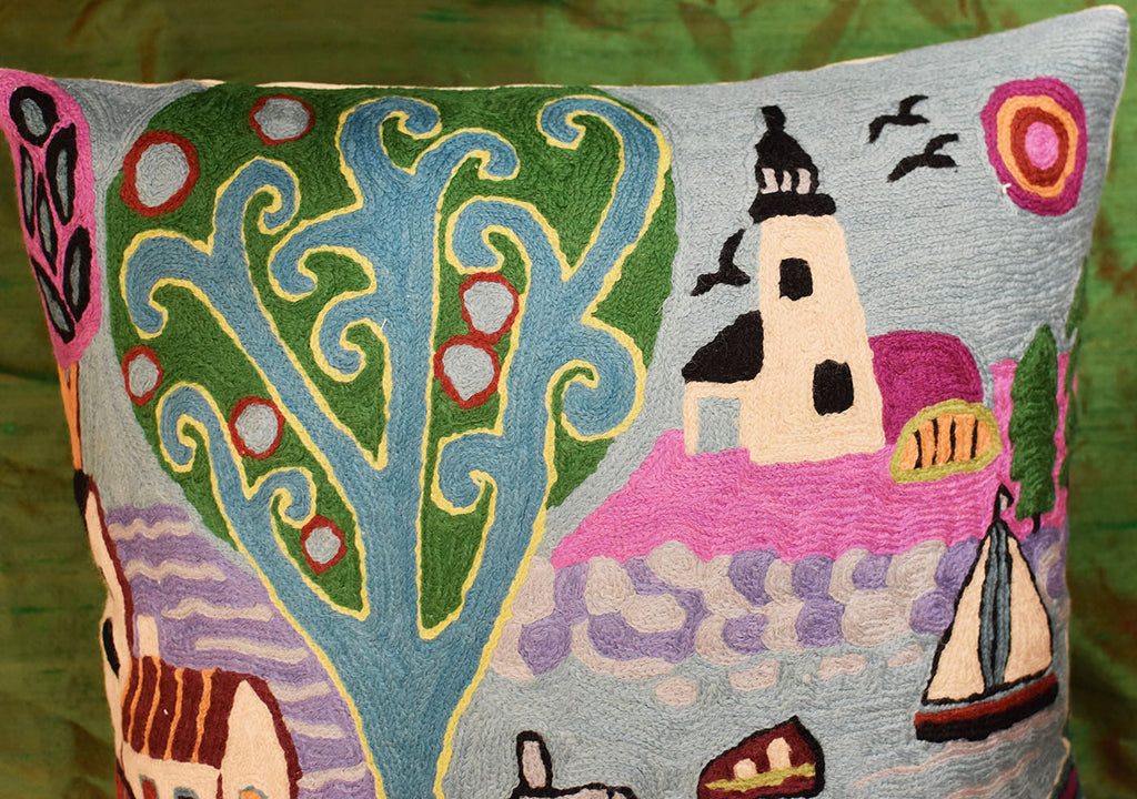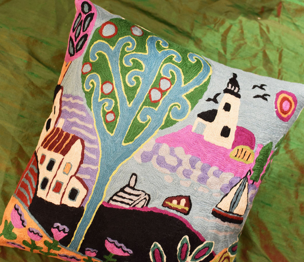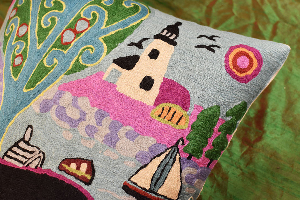 A close-up view of this abstract pillow cover allows you to see the amazing chain-stitch embroidery work of master artisans who have practiced this art their entire lives.This abstract decorative pillow cover could grace the cabin of your boat or the chair in your solarium and yet be equally as comfortable in your den.