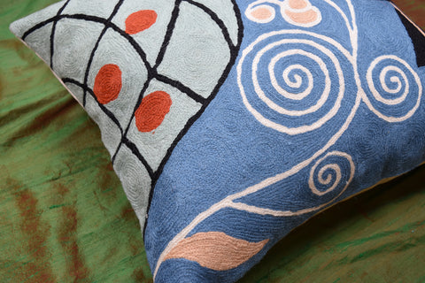 Klimt Blue Seed Pillow Cover Elements Art Nouveau Cushion Cover Hand Embroidered Wool 18x18"