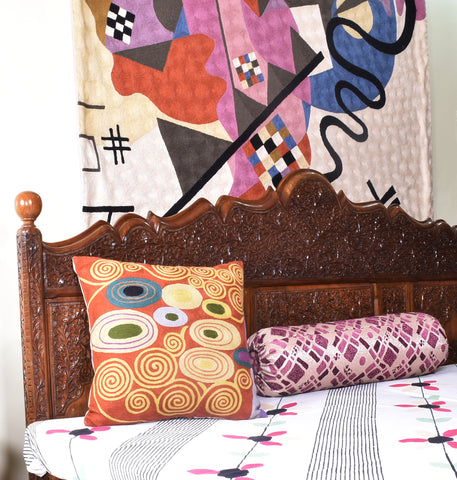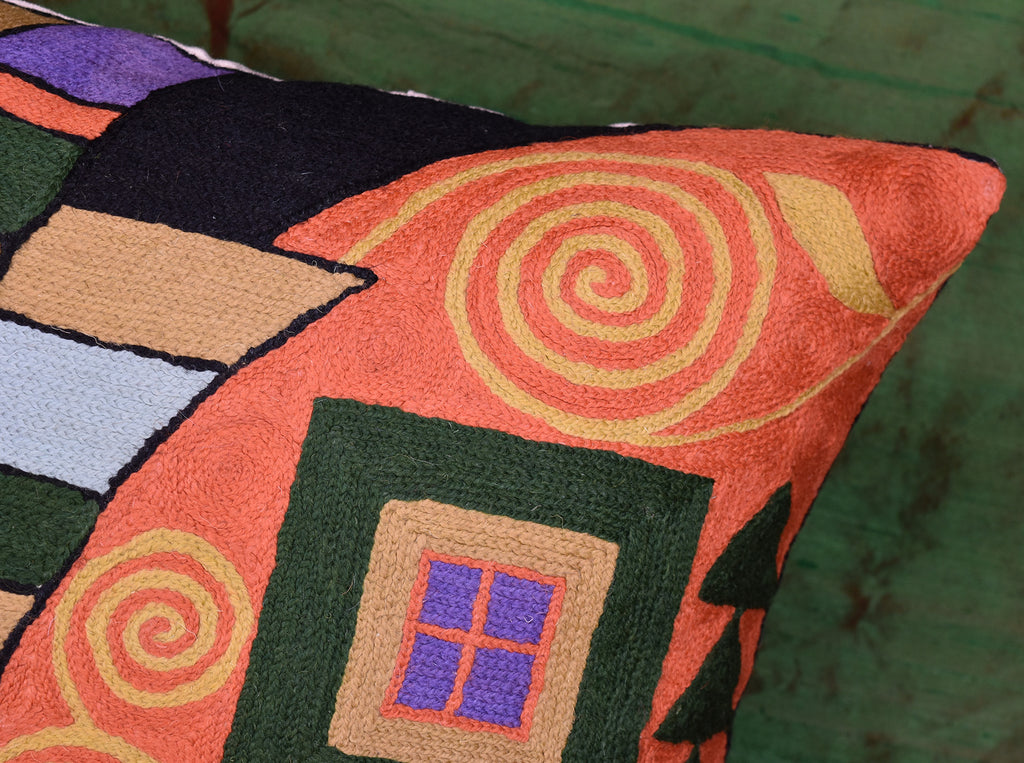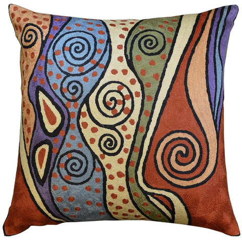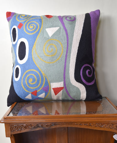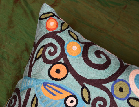 A close-up view of this abstract pillow cover allows you to see the amazing chain-stitch embroidery work of master artisans who have practiced this art their entire lives.This abstract decorative pillow cover could grace the cabin of your boat or the chair in your solarium and yet be equally as comfortable in your den.