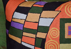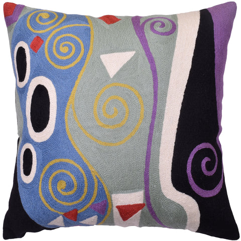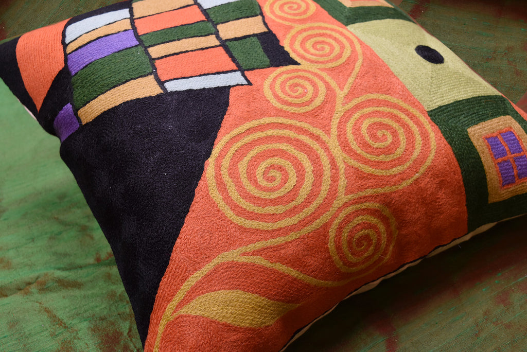 Klimt Pillow Cover - The Tree of Life branching up to the night sky with and its roots in the earth. Using elements of Klimt, yet quite possibly also inspired by Van Gogh's 'The Starry Night,' this piece offers a dramatic accent to any room. The entire cotton base of the pillow is overlaid with soft wool, stitch by stitch, creating an extraordinary show piece for your decor. This is world-class workmanship created to enhance your world with dynamic color and motif.
