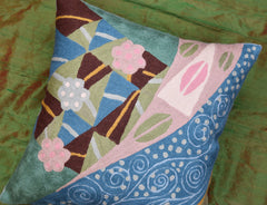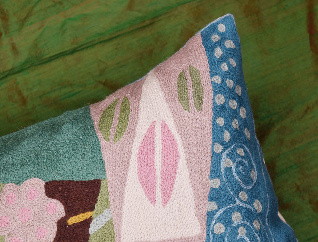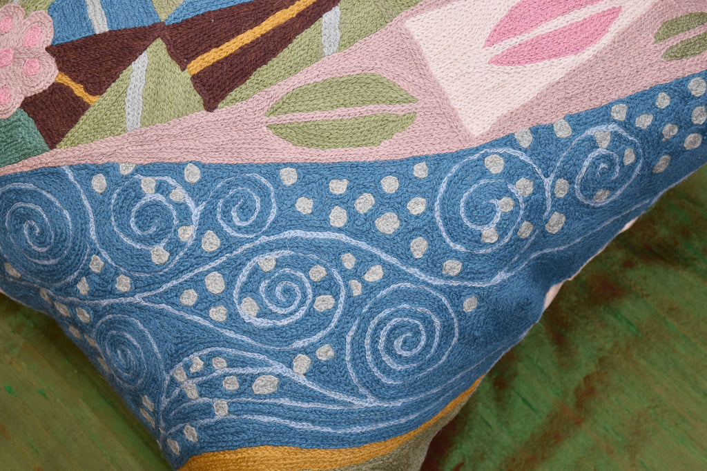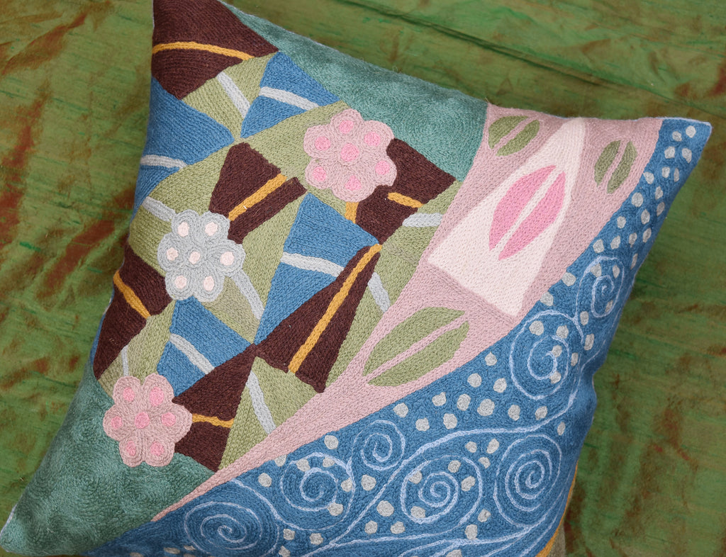 Klimt Blue Seed Elements Cushion Cover - Celebrate Spring with this pillow cover! Flowers, seeds, seed pods, and maybe even a pair of pink lips (Gustav Klimt was all about 'The Kiss') adorn this gorgeous natural fabric, hand-embroidered, wool, chain stitch pillow cover. This unique accent pillow cover design is fashioned after the modern art of Gustav Klimt. Chain stitch is a refined form of hand-worked crewel embroidery produced by the finest Kashmiri artisans. The entire cotton base of the pillow is overlaid with soft wool, stitch by stitch, creating an extraordinary showpiece for your decor. This is world-class workmanship created to enhance your world with dynamic color and motif.