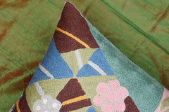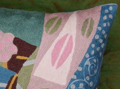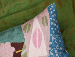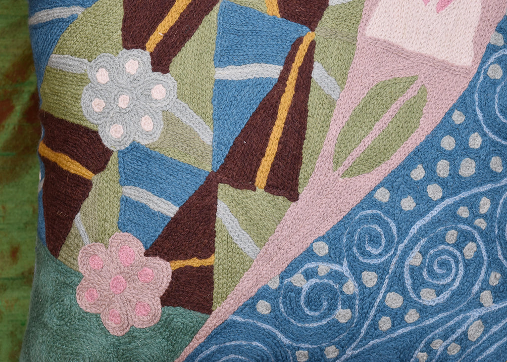 A close-up view of this abstract pillow cover allows you to see the amazing chain-stitch embroidery work of master artisans who have practiced this art their entire lives.This abstract decorative pillow cover could grace the cabin of your boat or the chair in your solarium and yet be equally as comfortable in your den.